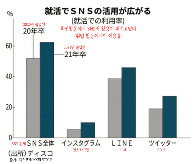 취직 정보 회사인 디스코(도쿄・文京)의 조사에 의하면, SNS를 취업 활동에서 사용했던 적이 있다고 대답한 학생은 2021년 졸업생이 62.4%로, 2020년 졸업생과 비교하여 10% 증가했다. 가장 이용률이 높은 것은 LINE으로 45.9%, 트위터가 27.3%로 이어졌다. LINE은 2020년 졸업생 대비 7.3 포인트, 트위터는 8.3포인트가 각각 상승했다.